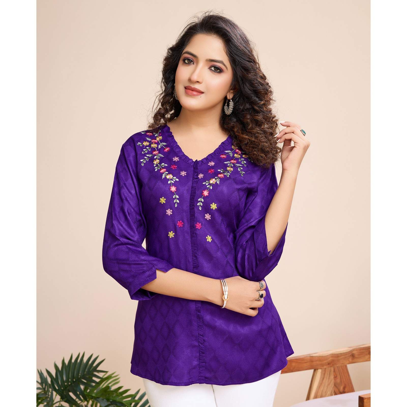Fashionista's loves for Ikat printed bored schiffli on brown and cream cotton blend a-line top for a fresh chic look. Featuring stylish mandarin collar with ruffles and lace detailing with mock button placket in front and puff sleeve. Style with white or black pants for a perfect chic look and it comes with pure cotton lining.