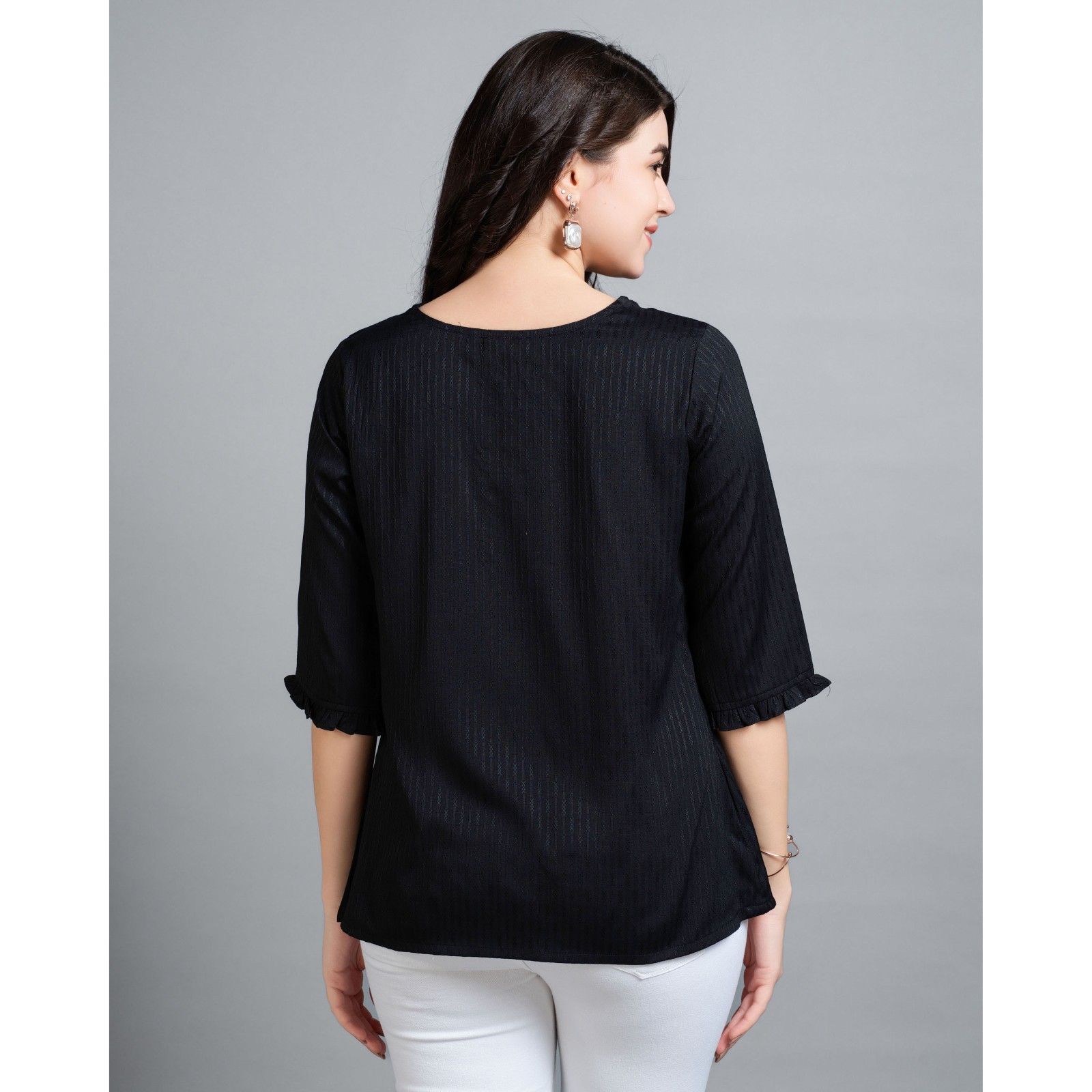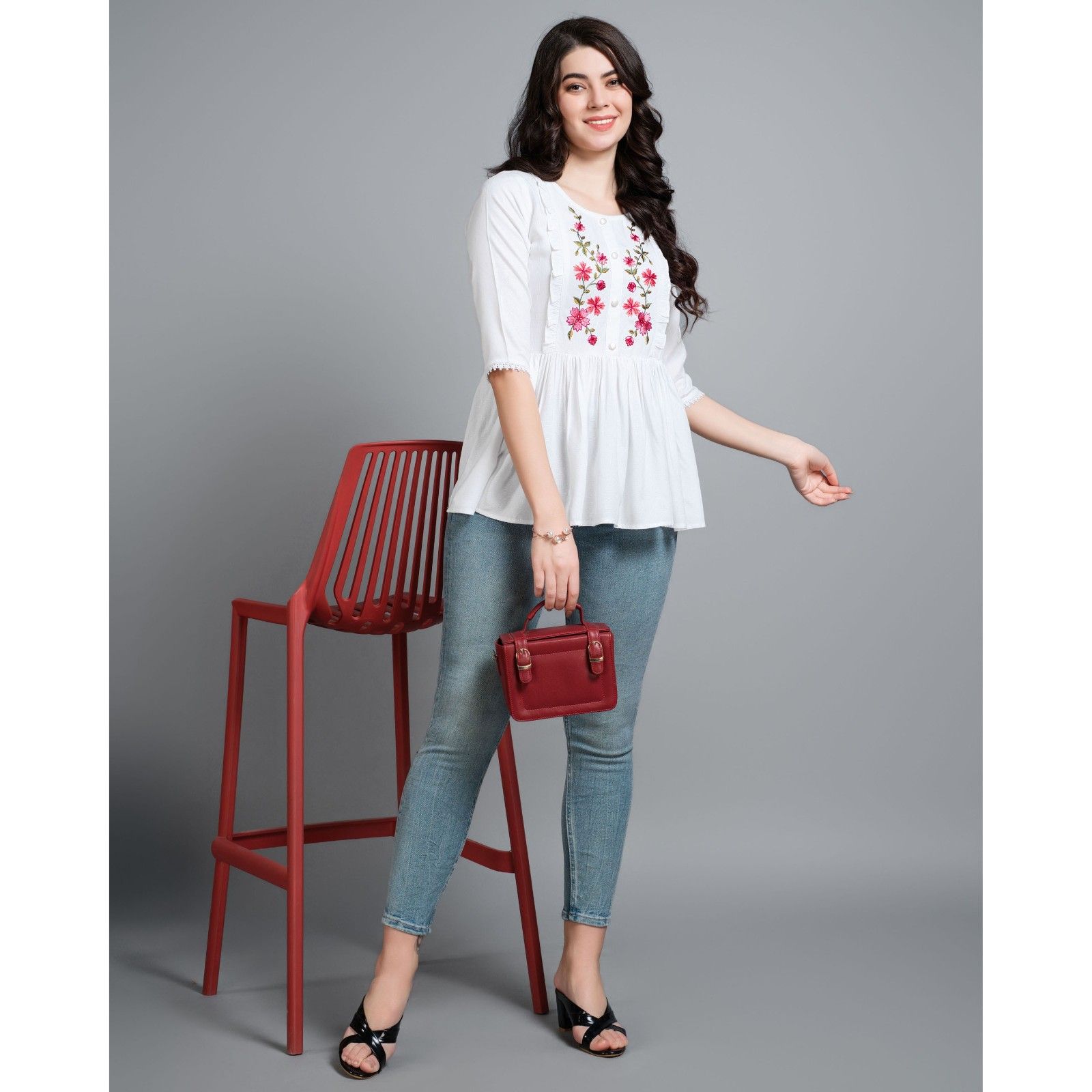 Spruce up your ethnic wardrobe with this green kurta from MOJILAA. Tailored in a breathable viscose fabric, this gorgeous kurta features a regular fit, sequins embroidery on yoke, lace-work, a round neck and three quarter sleeves. Team it up with flared sharara, juttis, statement jewellery, and a potli bag for a stunning look.