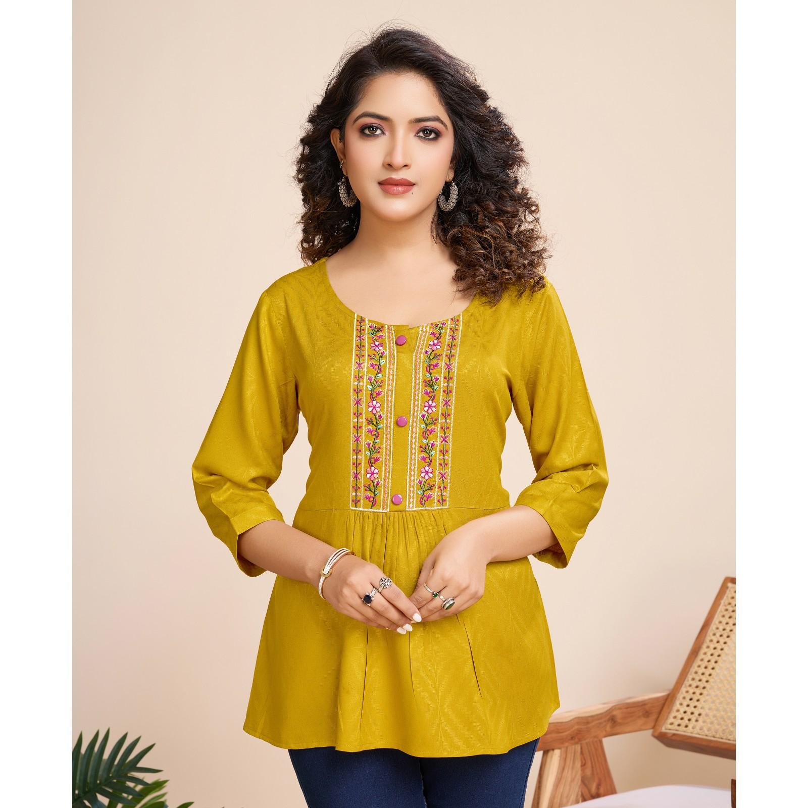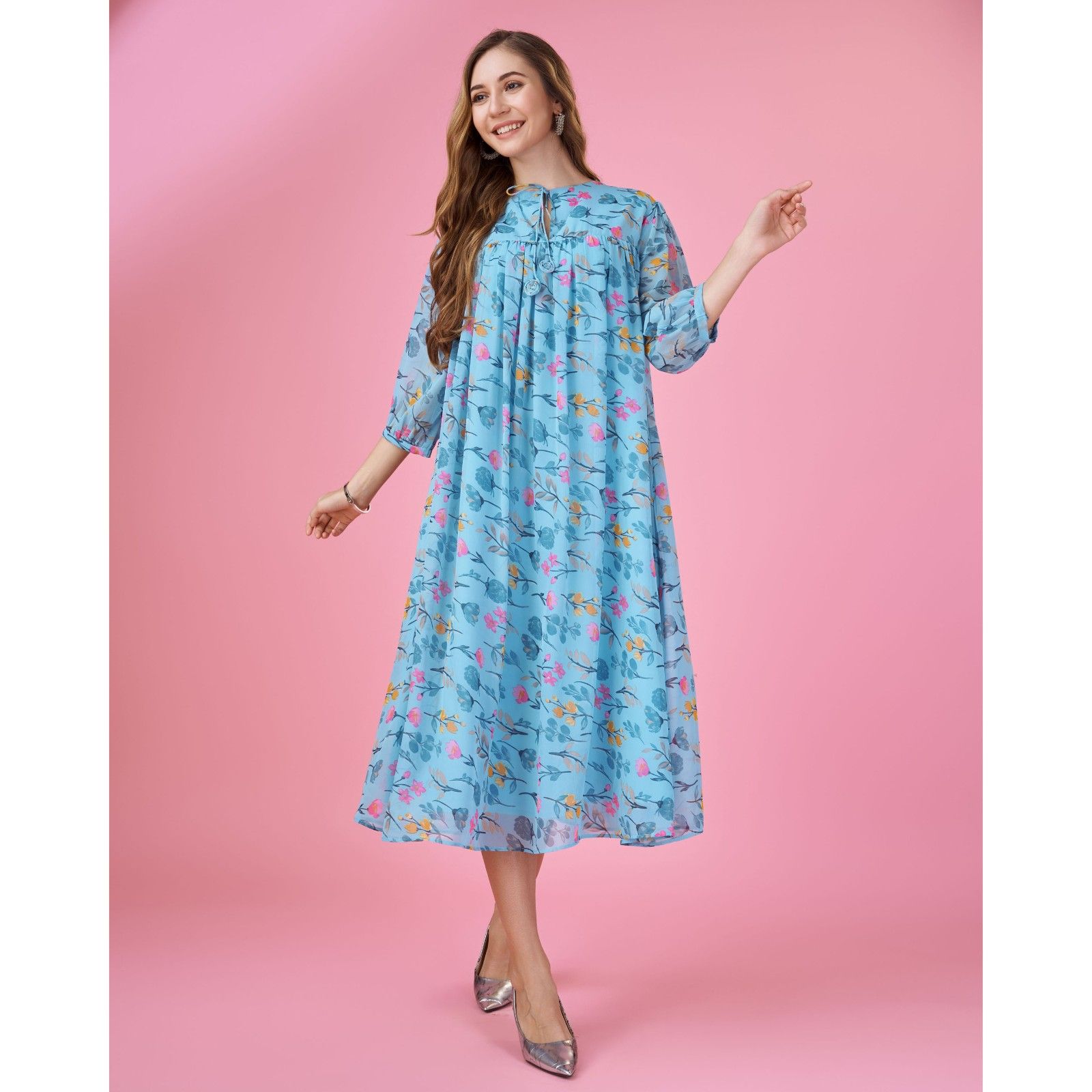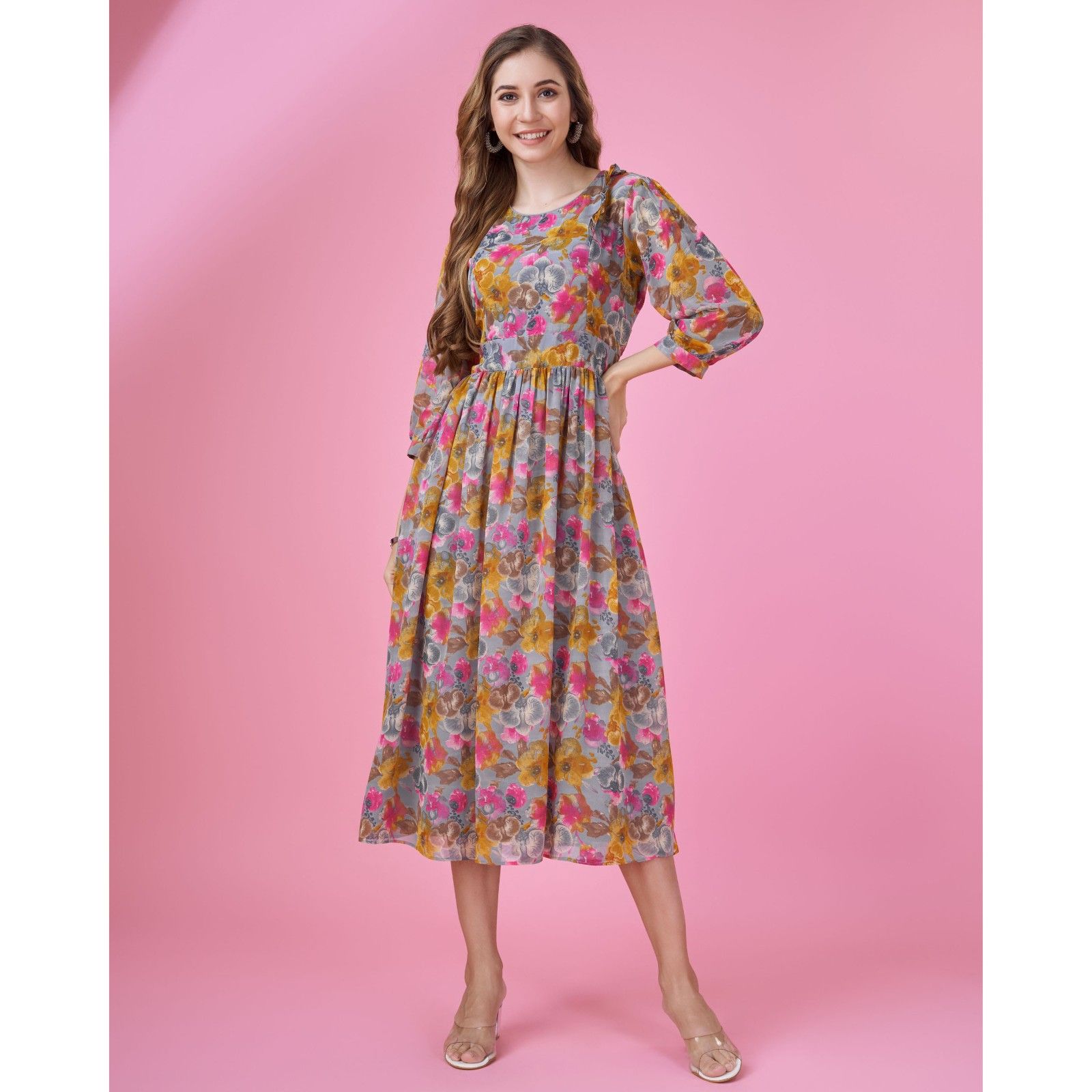 Grace your majestic styling instinct with this blossoming printed georgette wrap dress by MOJILAA. The Mustard and pink georgette wrap dress comes with crepe lining, all-over sunflower prints, a V-neckline, puffed sleeves, an attached tie-up on waist, and pleated, hook and eye closure.
