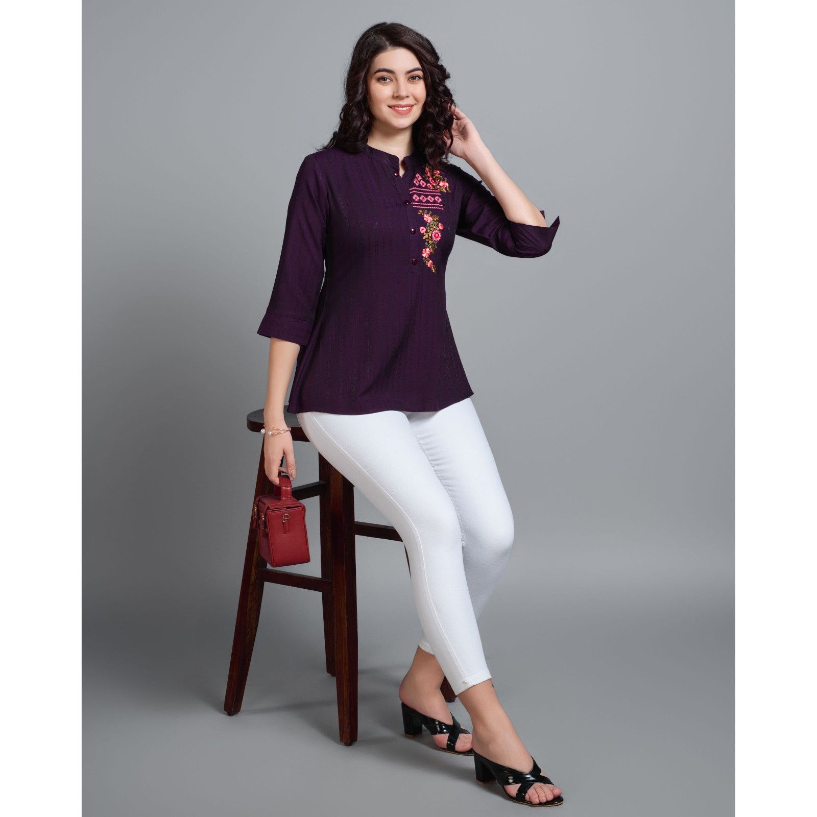 MOJILAA Women's Mustard Pure Viscose Rayon Floral Embroidered A-line Top