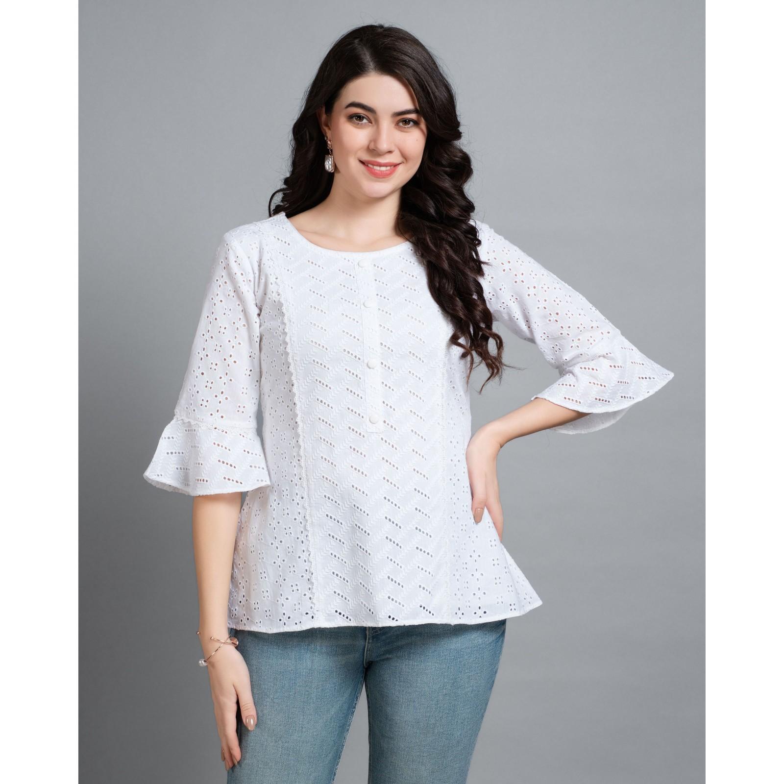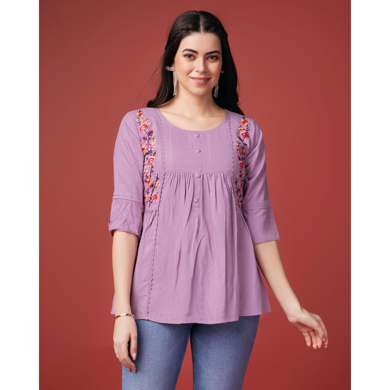 Embrace the colorful vibe and step out with confidence with the blue rayon top with multicolor embroidery by MOJILAA, knowing you're making a fashion statement that's uniquely yours. What truly sets this top apart is its captivating floral embroidery with sparkling buttons on yoke, where lush shades of pink take center stage and gathers with lace detailing on side waist. Combine it with solid-colored bottoms of your choice be it classic denim.