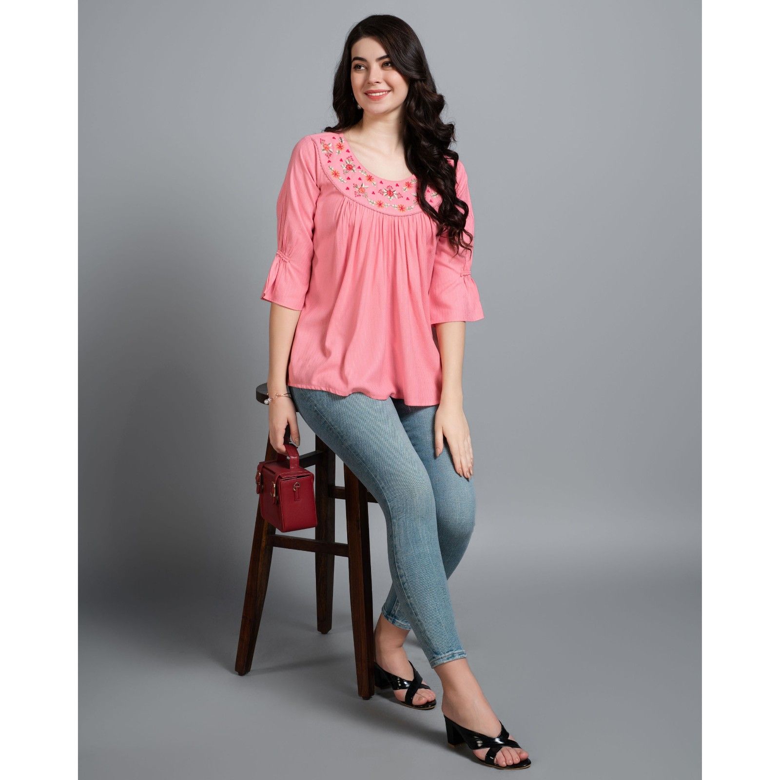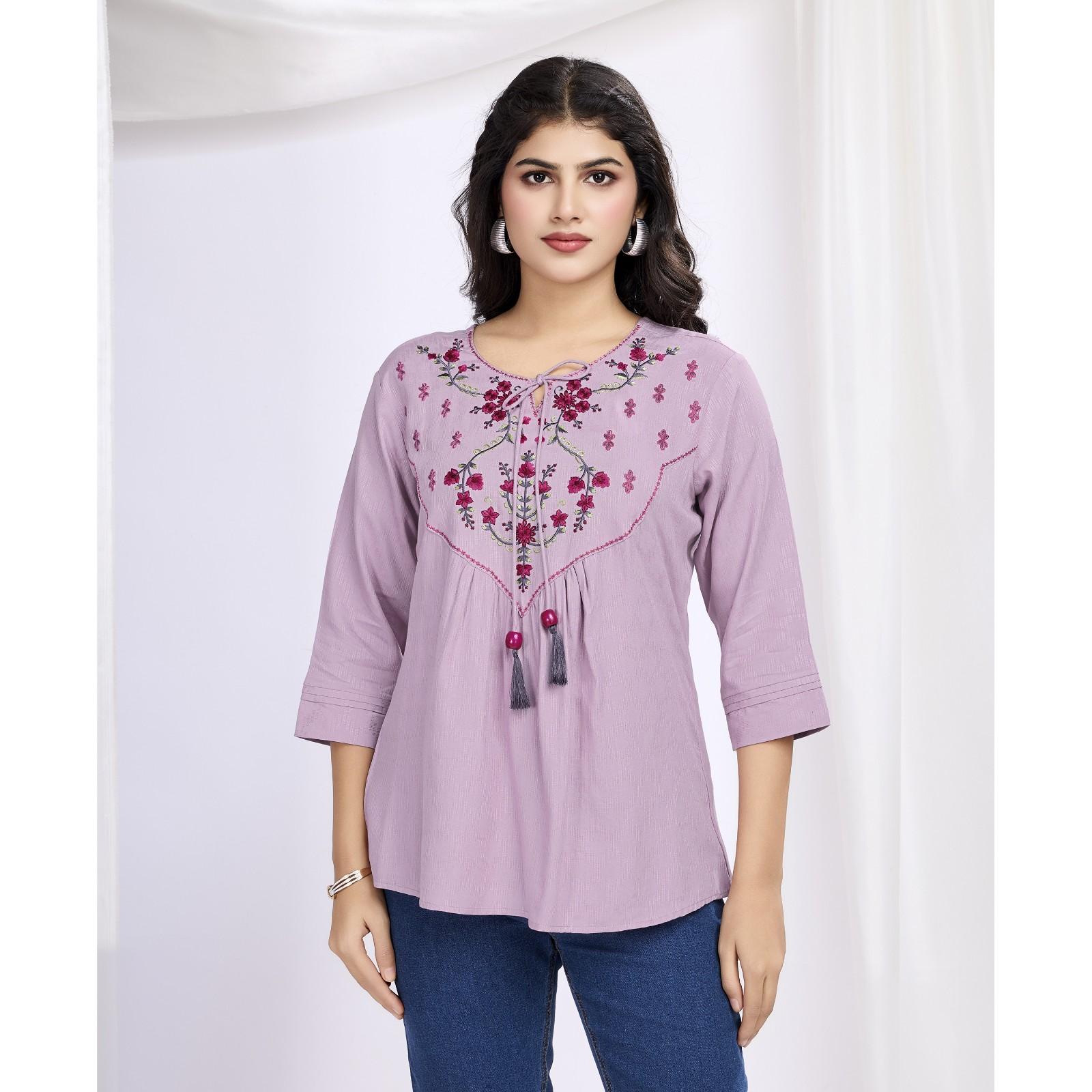 Embrace elegance and sophistication with the MOJILAA Women's Purple Pure Viscose Floral Embroidered Peplum Top, a mesmerizing blend of artistry and allure. This exquisite piece showcases delicate floral embroidery that dances across a sumptuous pure viscose fabric, offering a luxurious feel against your skin.