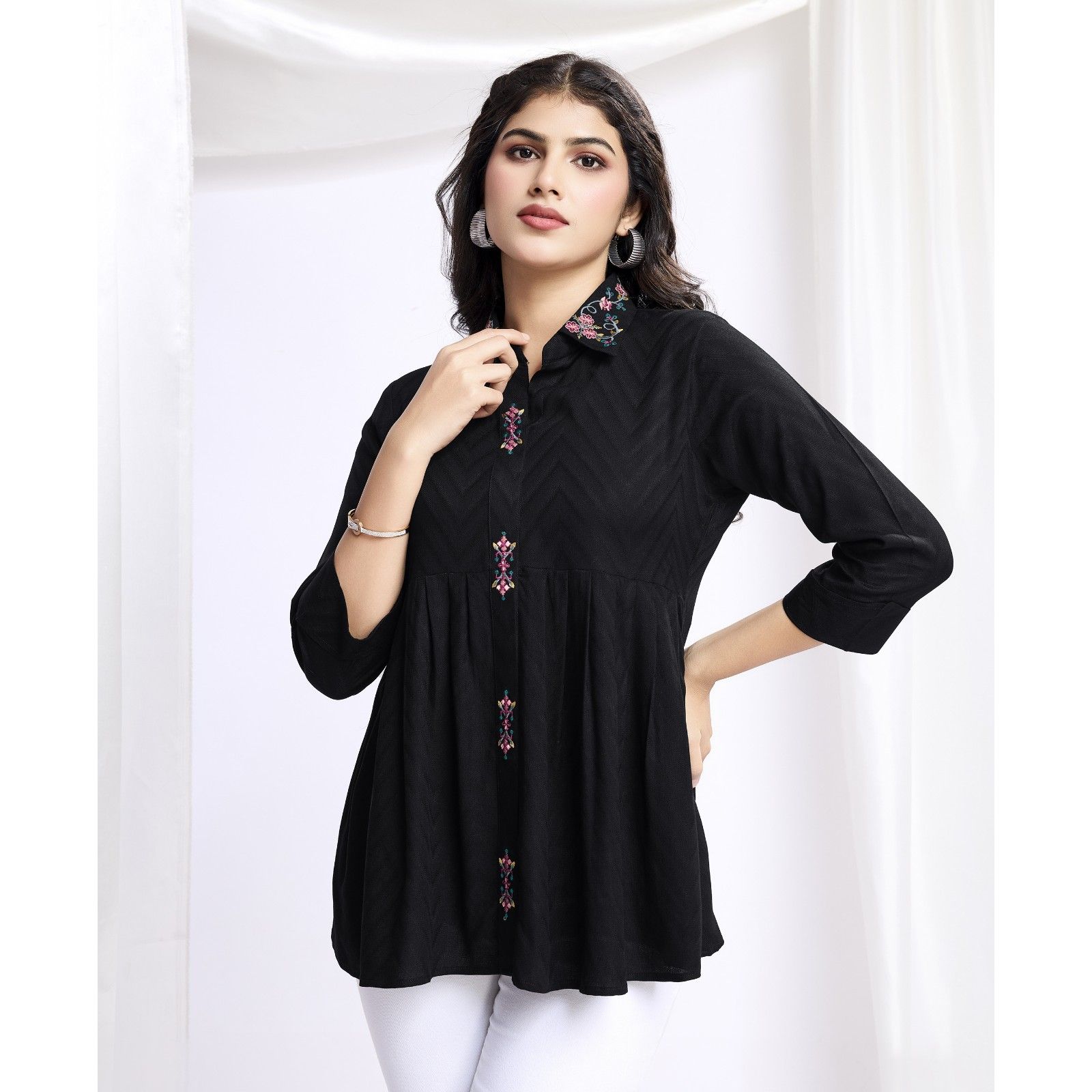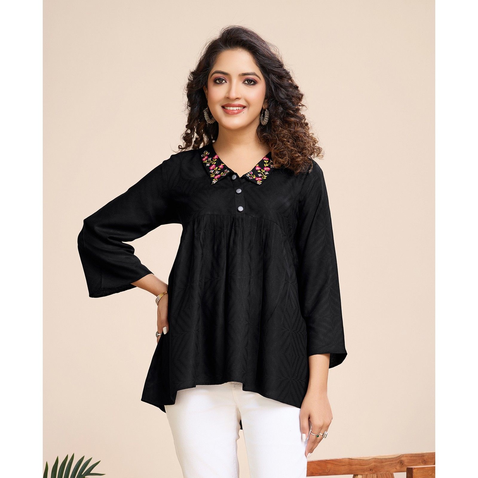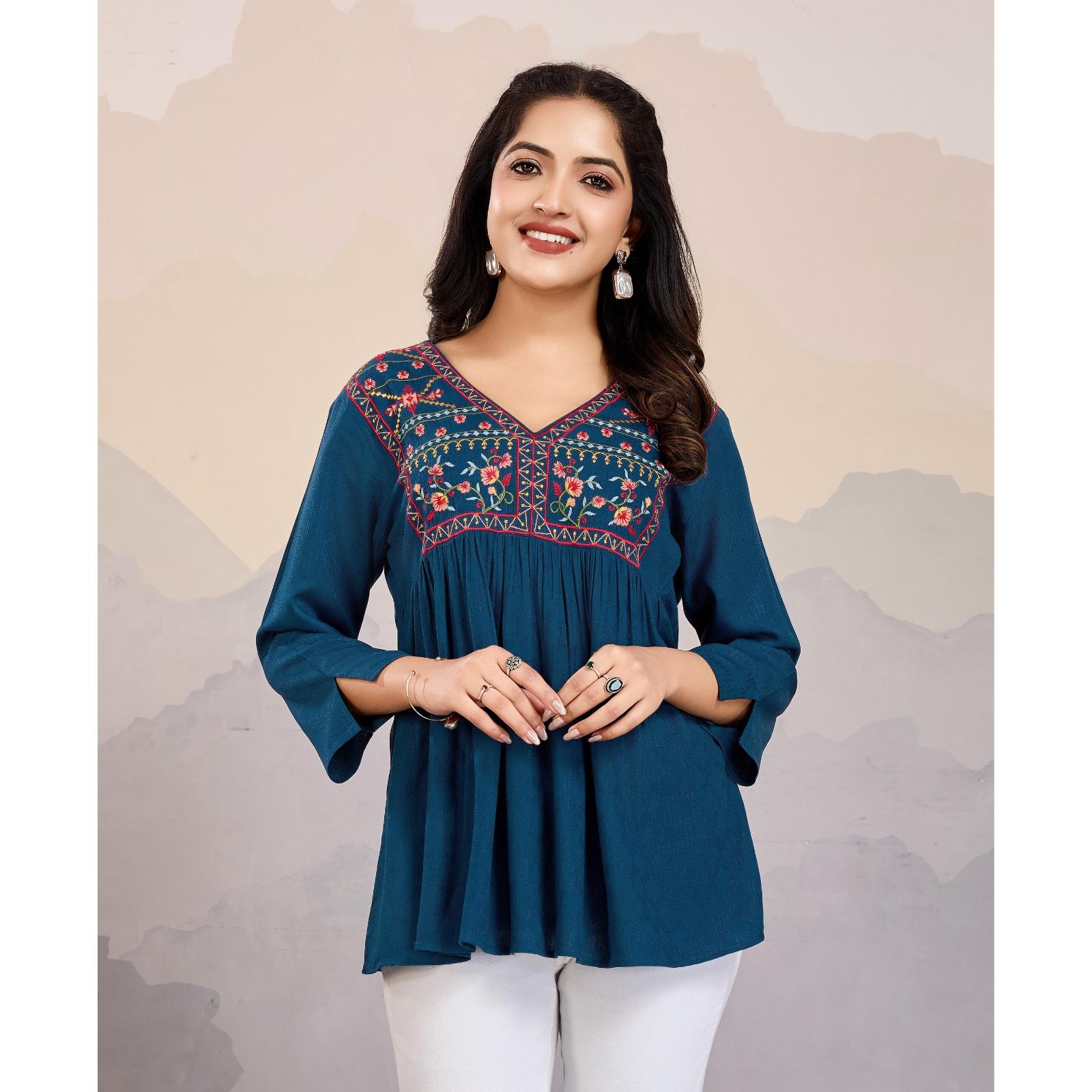 Unveil your unique elegance with the MOJILAA Women's Teal Pure Viscose Floral Embroidered A-line Top. A true manifestation of timeless grace fused with contemporary chic. Meticulously crafted from sumptuous pure viscose, this top drapes beautifully, offering a heavenly comfort that complements its ethereal appeal. The enchanting teal hue serves as a canvas for the exquisite floral embroidery, intricately detailed to capture and reflect your every subtle movement with an understated sophistication. Designed with an A-line silhouette, it gracefully accentuates your figure, ensuring a flattering fit for any body type. Whether you're stepping into a casual brunch or an evening soir??e, this enchanting piece stands ready to transform your ensemble into an unforgettable statement of style. Step into a world where elegance meets modernity, and let this MOJILAA masterpiece become your new wardrobe essential.