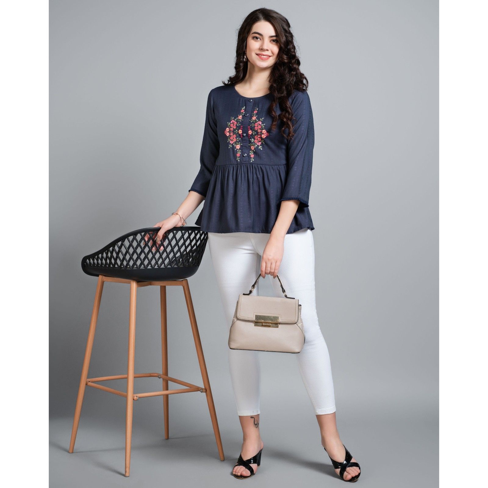 MOJILAA Women's White Pure Viscose Rayon Floral Embroidered A-line Top